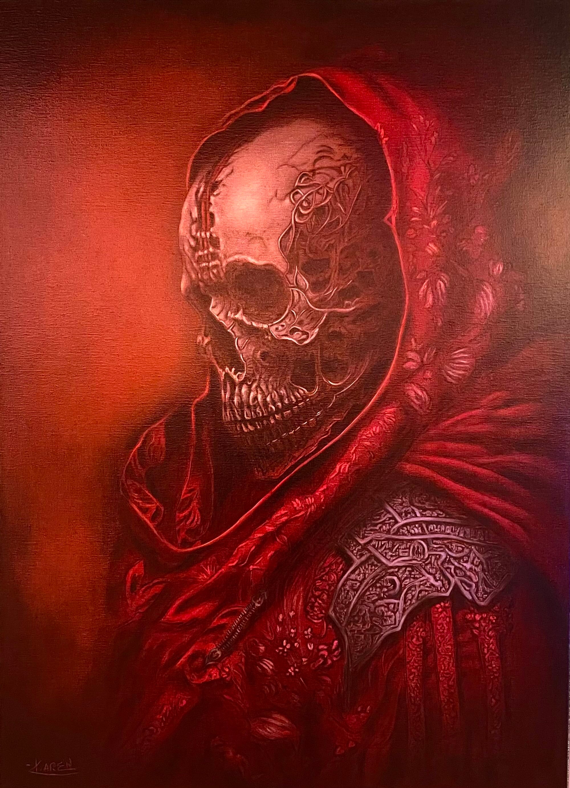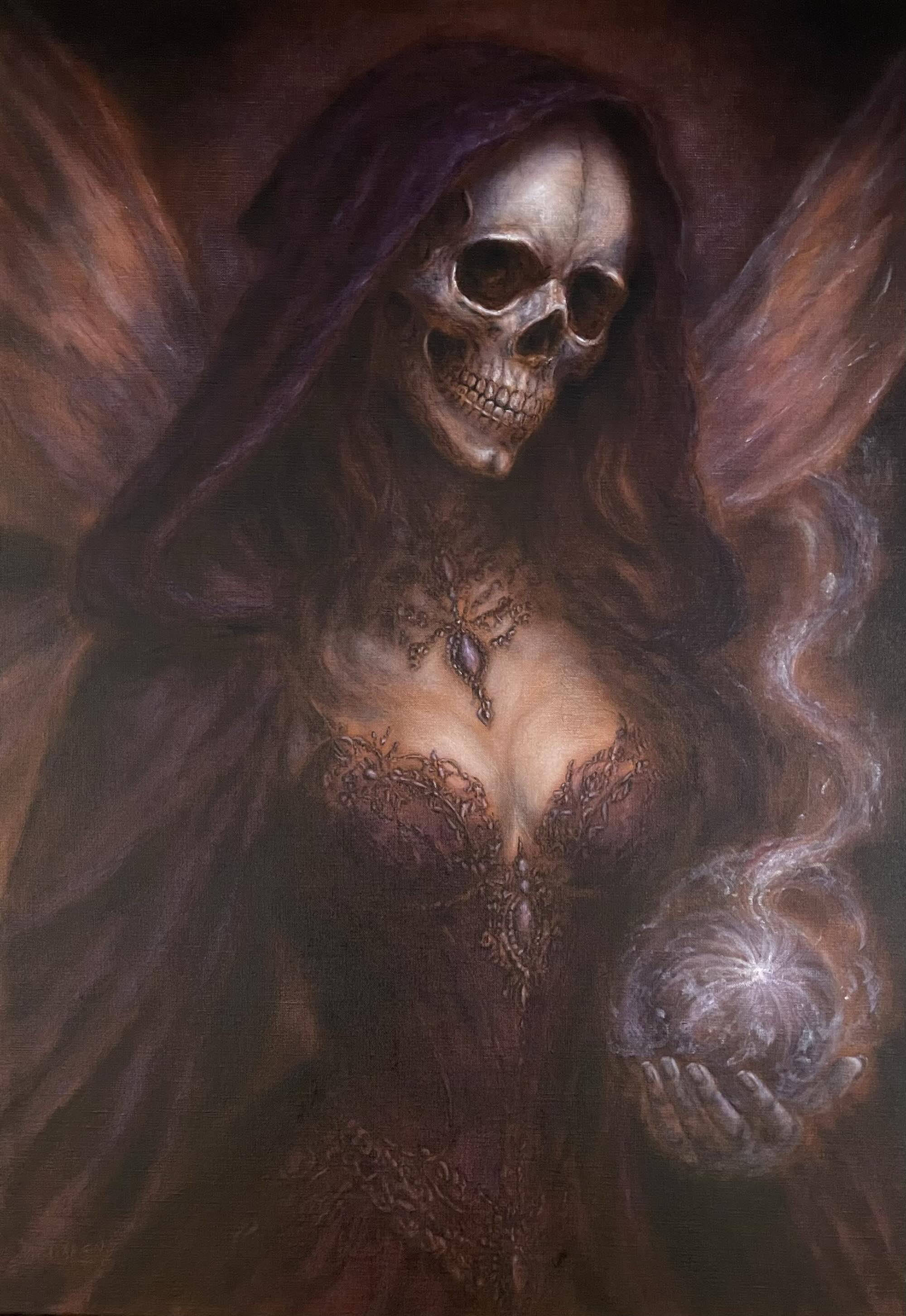 Dieses Werk lebt von der Verbindung aus weiblicher Stärke, feinen Flügeln und einer vielschichtigen violetten Farbigkeit.